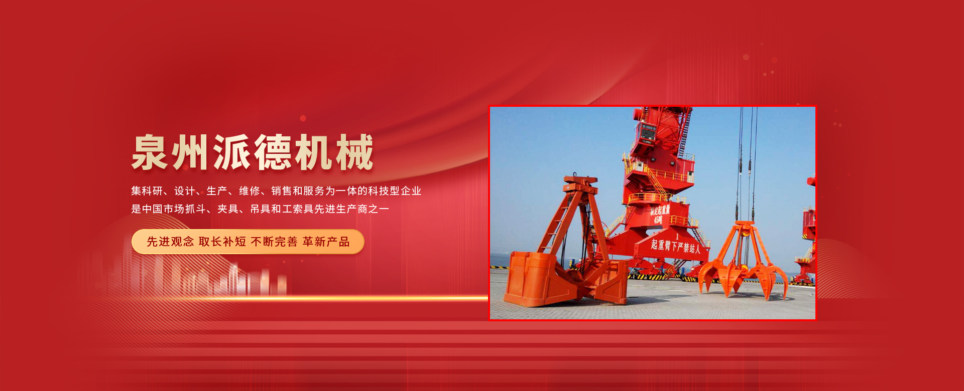 泉州派德機(jī)械有限公司成立于2012年5月,位于全國文明的古城福建泉州,公司擁有各類型專業(yè)員工82人,其中高級工程師1人,工程師4人,助理工程師5人,是一家集科研、設(shè)計(jì)、生產(chǎn)、維修、銷售和服務(wù)為一體的科技型企業(yè),是中國市場抓斗、夾具、吊具和工索具先進(jìn)生產(chǎn)商之一。產(chǎn)品采用國內(nèi)外先進(jìn)的設(shè)計(jì)方案、技術(shù)規(guī)范、制造過程、工藝流程和服務(wù),憑借在抓斗、夾具、吊具和工索具領(lǐng)域的超前設(shè)計(jì)理念和成熟的技術(shù)、工藝和管理,在抓具領(lǐng)域迅速崛起。